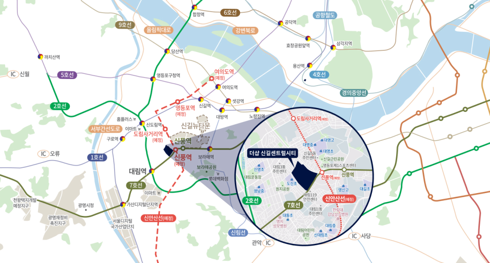 - 트리플 업무지구 접근성: 여의도(신안산선), 강남(7호선), 가산디지털단지(7호선)를 모두 20~30분 내에 갈 수 있는 독보적 직주근접성입니다.